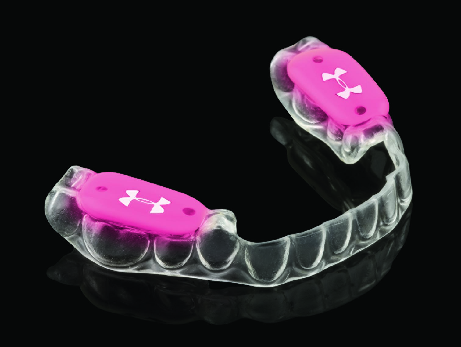 The pink mouthpieces and mouthguards will offer wearers the same benefits as the original line of UA Performance Mouthwear, including increased strength and endurance, as well as reduced athletic stress. Custom-built and scientifically proven, performance mouthwear can help athletes unlock their full potential to become stronger, faster and better. The technology was created by Bite Tech, which has partnered with Under Armour and Patterson Dental to introduce UA Performance Mouthwear.